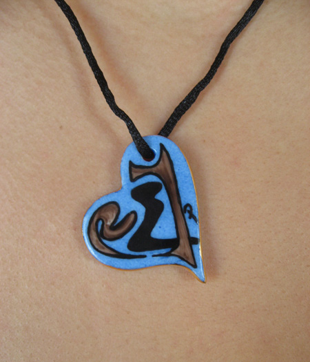 Pendentif en forme de coeur et aux motifs abstraits. Le bord est peint en or
