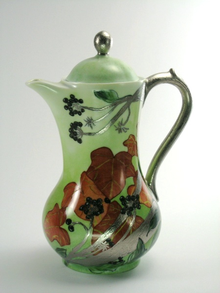 Dans le style art nouveau, cette cafetière est ornée de feuilles et de décors en platine.