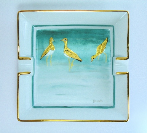 Motif d'inspiration japonaise. Les oiseaux sont en relief et en or. Le bord est en or également.