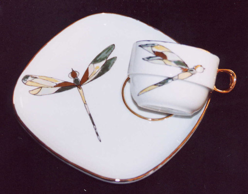 Tasse déjeuner avec son plateau assorti. Le plateau et la tasse sont bordés d'or.