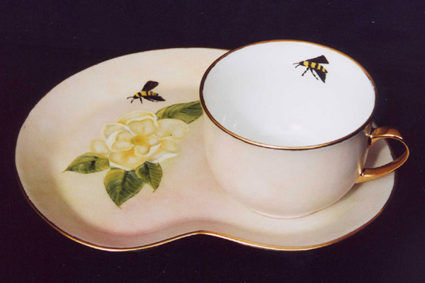 Tasse déjeuner avec son plateau assorti. Le plateau et la tasse sont bordés d'or.