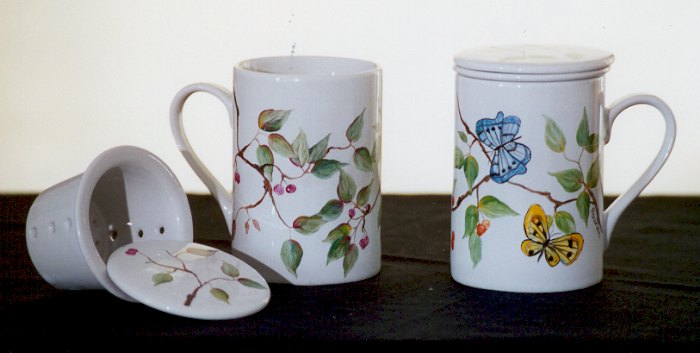 Ces mugs sont accompagnés d'un panier en porcelaine pour mettre les feuilles de thé, ainsi que d'un couvercle.