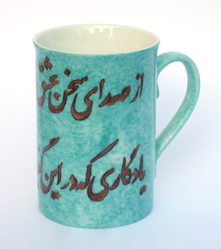 Mug orné d'un poême persan calligraphié.