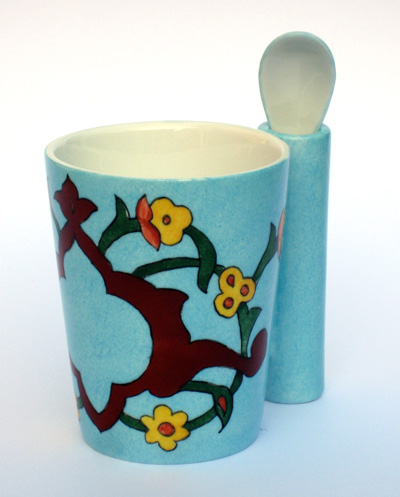 Mug orné d'un motif persan. Une cuiller en porcelaine se range dans l'anse.