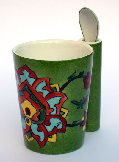 Mug orné d'un motif persan. Une cuiller en porcelaine se range dans l'anse.